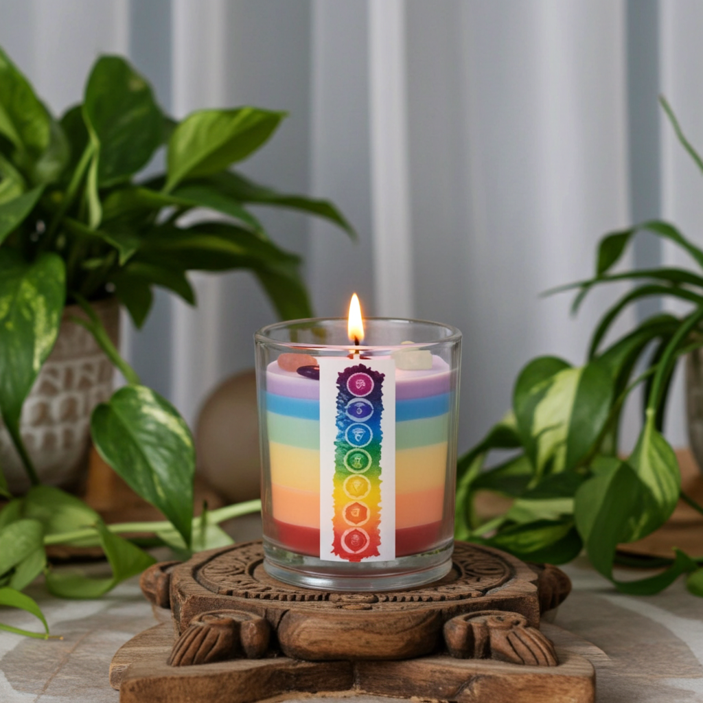 These vibrant layered chakra candles provide a focus point for meditation, they also provide the air around you with scents made from Floral essential oils to correspond with each chakra to balance them. The healing stones release good vibrations and are energetically charged. When the candle is finished, let wax cool, remove crystals and wash with soap and hot water.