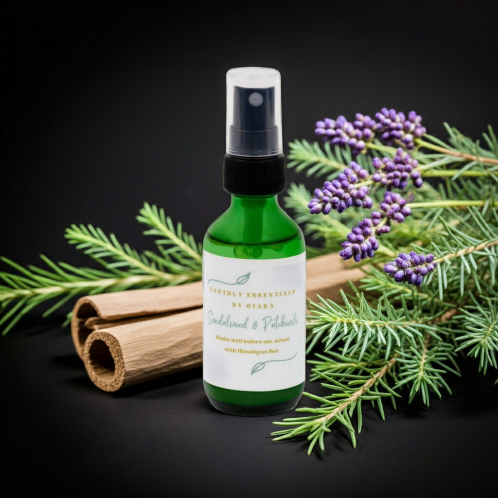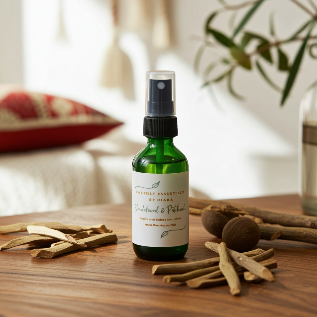 It will arrive in a beautiful green 2 oz. spritzer bottle infused with sandalwood and patchouli essential oil. Custom label on bottle (printed)